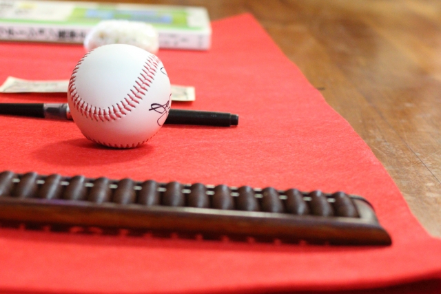 お子さんの前に、お金、絵本、赤飯、筆などを並べて、